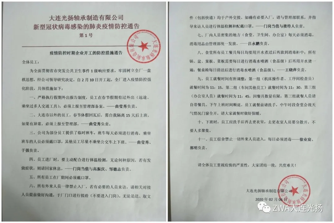這次疫情,如同一場無聲的戰爭,在這次戰斗中,大連光揚軸承制造有限公司的領導班子不等不靠、先知先覺迅速做出抗疫響應: